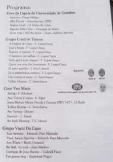 O Coro anfitrião, dirigido pelo Maestro Paulo Moniz, abriu o concerto. Seguiram-se o Grupo Coral de Tancos e o Coro Vox Maris, respectivamente dirigidos pelos Maestros Pedro Alexandre Correia e Rui Vicente Pinto. Encerrou o concerto o Grupo Coral Da Capo sob a direcção do Maestro Eduardo Paes Mamede.